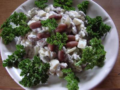 Сердце и яйцо мелко порезать, лук порезать полукольцами и замариновать слегка лимонным соком с перцем, добавить фасоль и заправить майонезом.