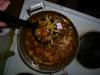 Добавить чеснок, а затем сразу выложить сосиски. Обжаривать сосиски ~5-7 минут на среднем огне до румяности, затем переложить их в кастрюлю с бульоном.