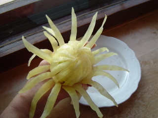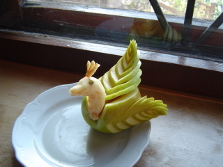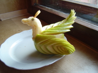 9.С помощью таких несложных разрезов и сдвигов можно сделать разные варианты птиц Мастер-класс "Лебедь из яблочка (карвинг)"8.Теперь сдвинув разрезы,мы получаем - лебедя