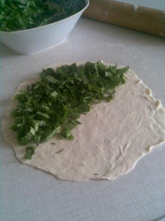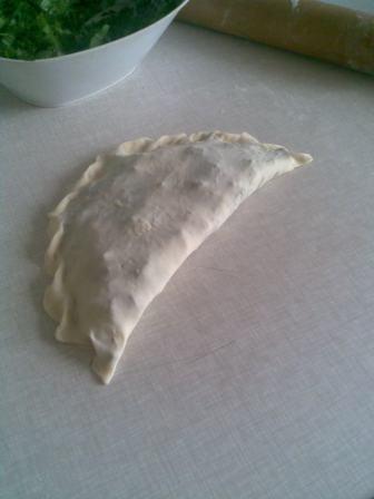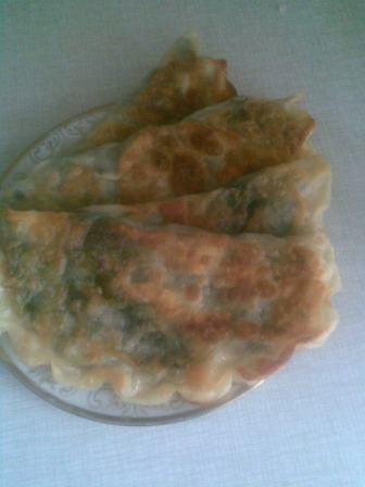 Раскатать тесто в тонкий пласт, на одну половинку выложить зелень, немного посолить, накрыть зелень второй половинкой и защипить краю. Остается только пожарить. Некорые хозяйки жарят гутаб без масла, а затем смазывают их маслом. Моя мама намазывает маслом непосредсивенно во время жарки. А свекровь просто заливает небольшое количество растительного масла на сковороду. Я жарю по третьему варианту. Но масла надо добавлять немного, не пирожки жарим (кстати их я тоже обожаю
