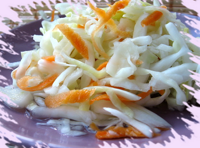 Капусту нашинковать, морковь натереть, чеснок растолочь. Перемешать и залить маринадом. Поставить под гнёт на 30 мин.