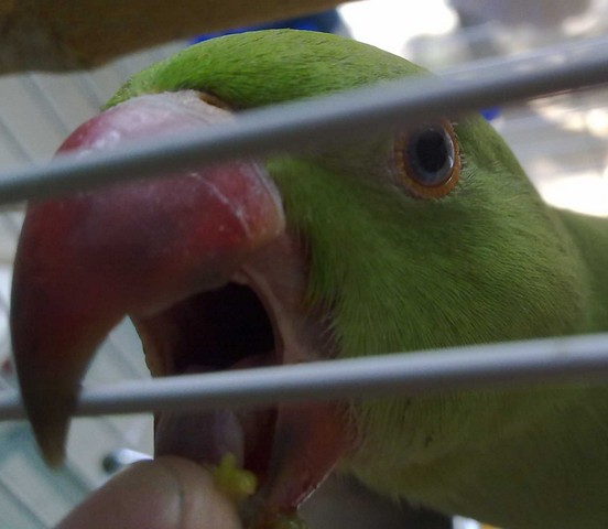 я уже писала что он у меня добрячок...каждый вечер я его ловлю и приучаю к рукам,глажу его,вычесываю колодочки,клюв почесу...иногда и мурлычет бывает...вижу ему и нравится когда его чешу,но все равно сердечко учащенно бьется,но не кусается.