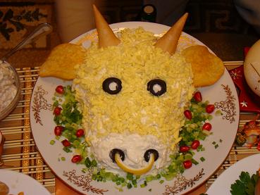 Выкладывать сразу в форме головы быка,; сделать рога - вафельные трубочки, уши - чипсы, глаза и ноздри - оливки.