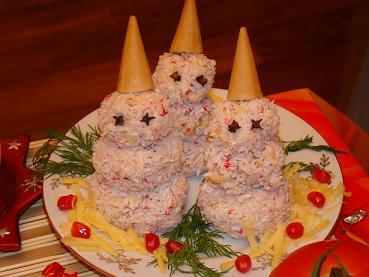 Твердый сыр, крабовые палочки трем на терке, добавляем измельченые орехи и майонез. Лепим шарики, обкатываем их в кокосовой стружке и с помощью зубочисток сооружаем снеговиков. А украсить можно так, как позволит время и фантазия.
