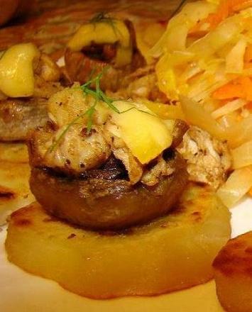Теперь готовые шляпки наполняем начинкой, сверху кладем сыр.