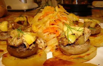 Шляпки ставим на картофельные кружки и отправляем в духовку или микроволновку, чтобы сыр расплавился..