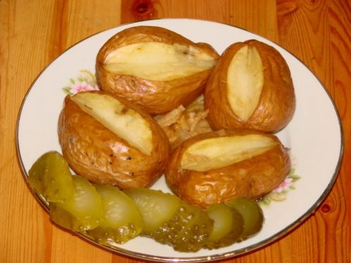 Василиса..а рецептик прост до неприличая: картошку хорошо намыть, даже щёткой начистить, лучше порезать пополам (быстрее приготовится и ставить удобнее), сделать вырезы и в них положить мелкие кусочки сала. Поставить в духовку. Вкус обалденный! И с солёным огурчиком