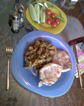 А на второй фото, отбивная что, сырая?? или это в процессе приготовления?