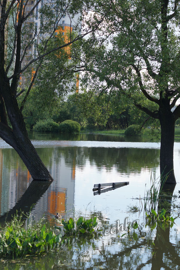 Вообще, в этом году пруд очень "полноводный" - половина дорожек так и не просохла, а бывшие островки до сих пор утоплены вместе со скамейками: