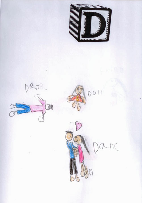 Вот читаю Кулёмины переживания про Тимкины рисунки. Моя до сих пор рисует контур чёрным маркером, а потом закрашивает, что посчитает нужным. Иногда всё, иногда только частично, "ключевые" детали. Вот как тут вот (страница из её книги иллюстраций к буквам)