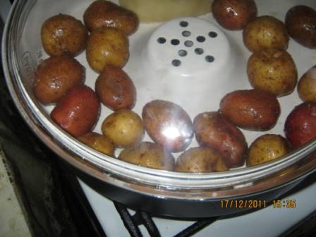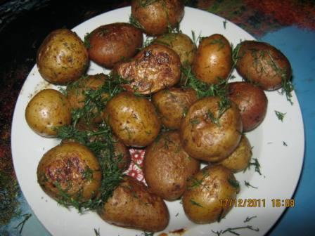 Мелкую картошку помыть, просушить. В пакет налить столовую ложку растительного масла и насыпать специй, выдавить зубочек чеснока. Туда поместить картошку и все перемешать. Нагреть жароварку. Положить картошку. Жарить 30 минут. Приятного аппетита