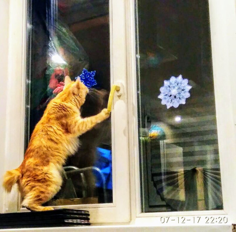 Наша красота сегодня первый раз пискнула. Хоть голос услышали. В руки так и не дается, но хоть выходить не боится. Уже елку завалила. Игрушки сдирает. Ночью может прилечь возле зятя.