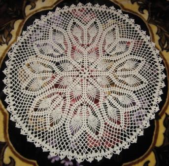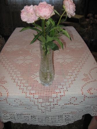 А вязала я её полтора месяца. Ну, и работа, домашние хлопоты - паралельно. А нитки достались даром. Кто-то выставил на площадку большой моток (я таких в продаже не видела) грязно-серых ниток. Я их отбелила, и связала скатерть и большую салфетку, и ещё остались нитки. Они хлопчатобумажные, но довольно толстые. Скатерть предназначена для дачи. А крючок, честно говоря, не помню. У меня много разных, просто подобрала подходящий.
