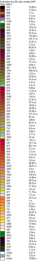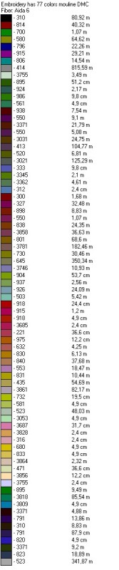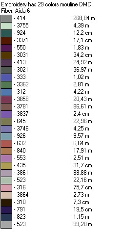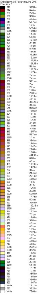 Ну вот, теперь понятно: нитки DMC, 29 цветов, канва Аида 6, после цвета идет номер ниток, затем их количество в см (м).