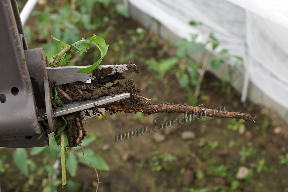 Работается инструментом очень легко - вставляем в серединку растения, нажимая ногой на рычаг: