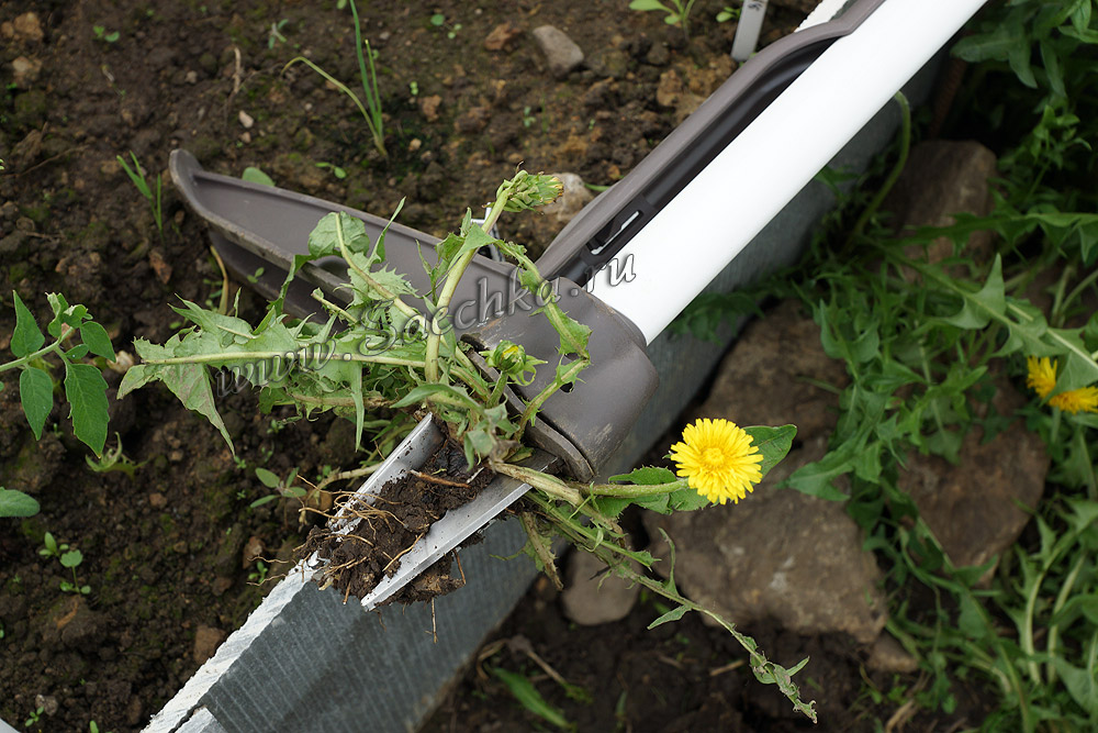 Так же легко выдергиваем одуванчик, нажимая все на тот же рычаг и держа инструмент под углом к сорняку: