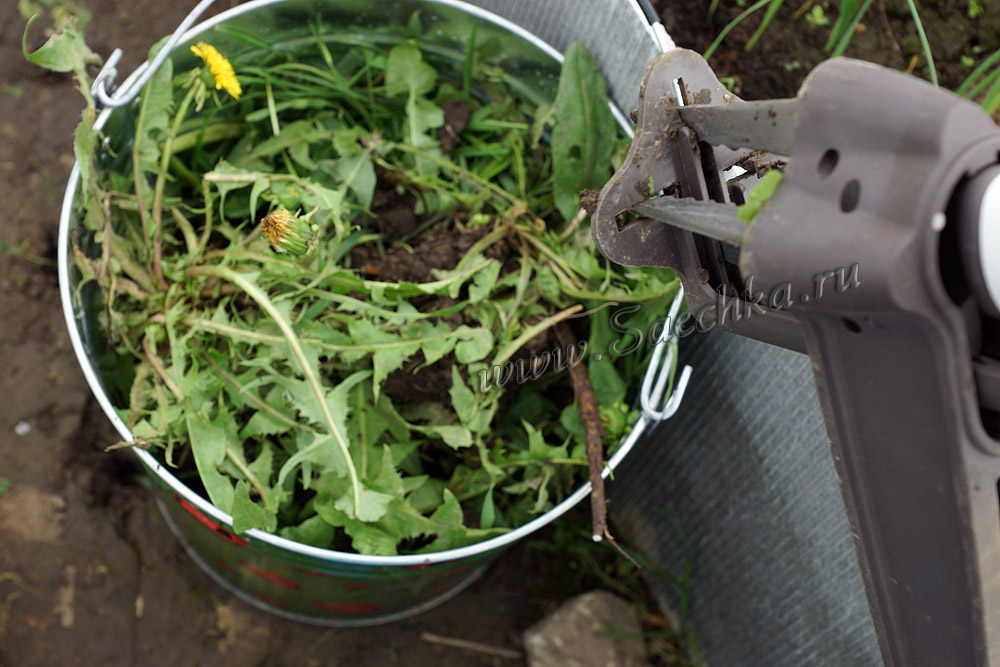 Далее просто сдвигаем легким движением руки движущиеся части удалителя сорняков и наш одуванчик падает в ведро: